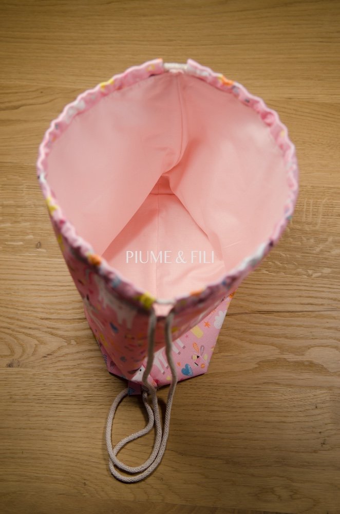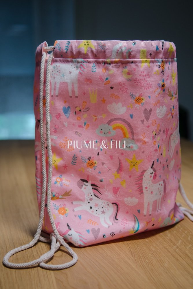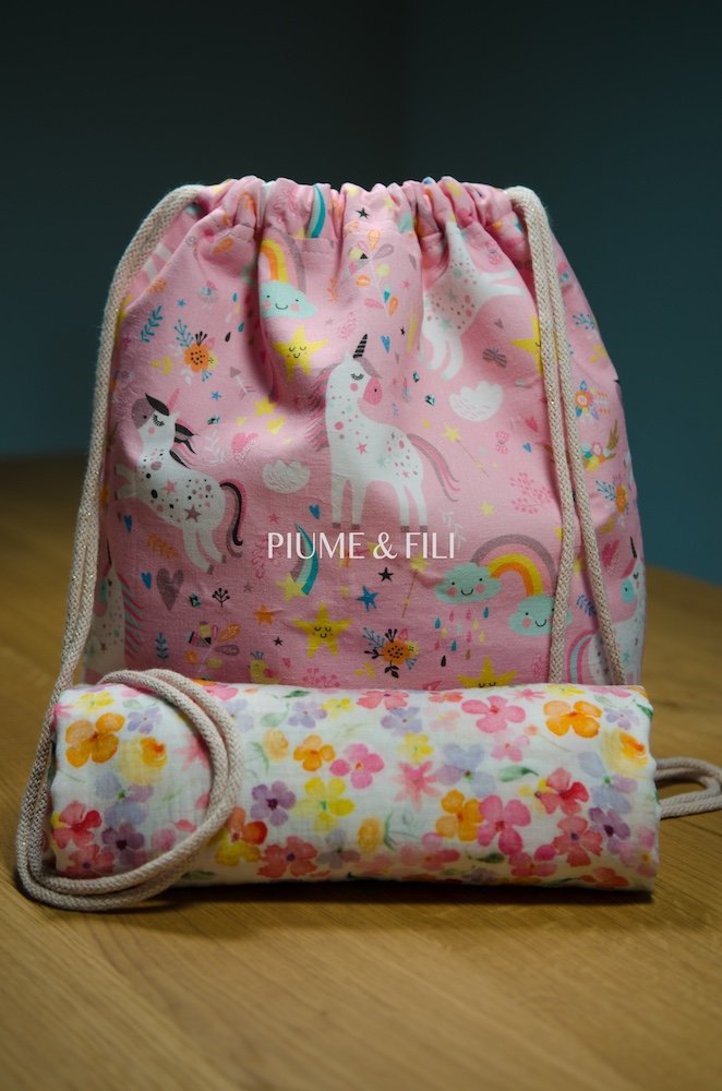 La chiusura a coulisse è pratica e veloce, perfetta per le manine dei bimbi, e il sacchetto si porta comodamente sulle spalle. Dentro c’è spazio per tutto l’essenziale: un cambio, una merenda, un piccolo gioco… e un pizzico di magia ✨